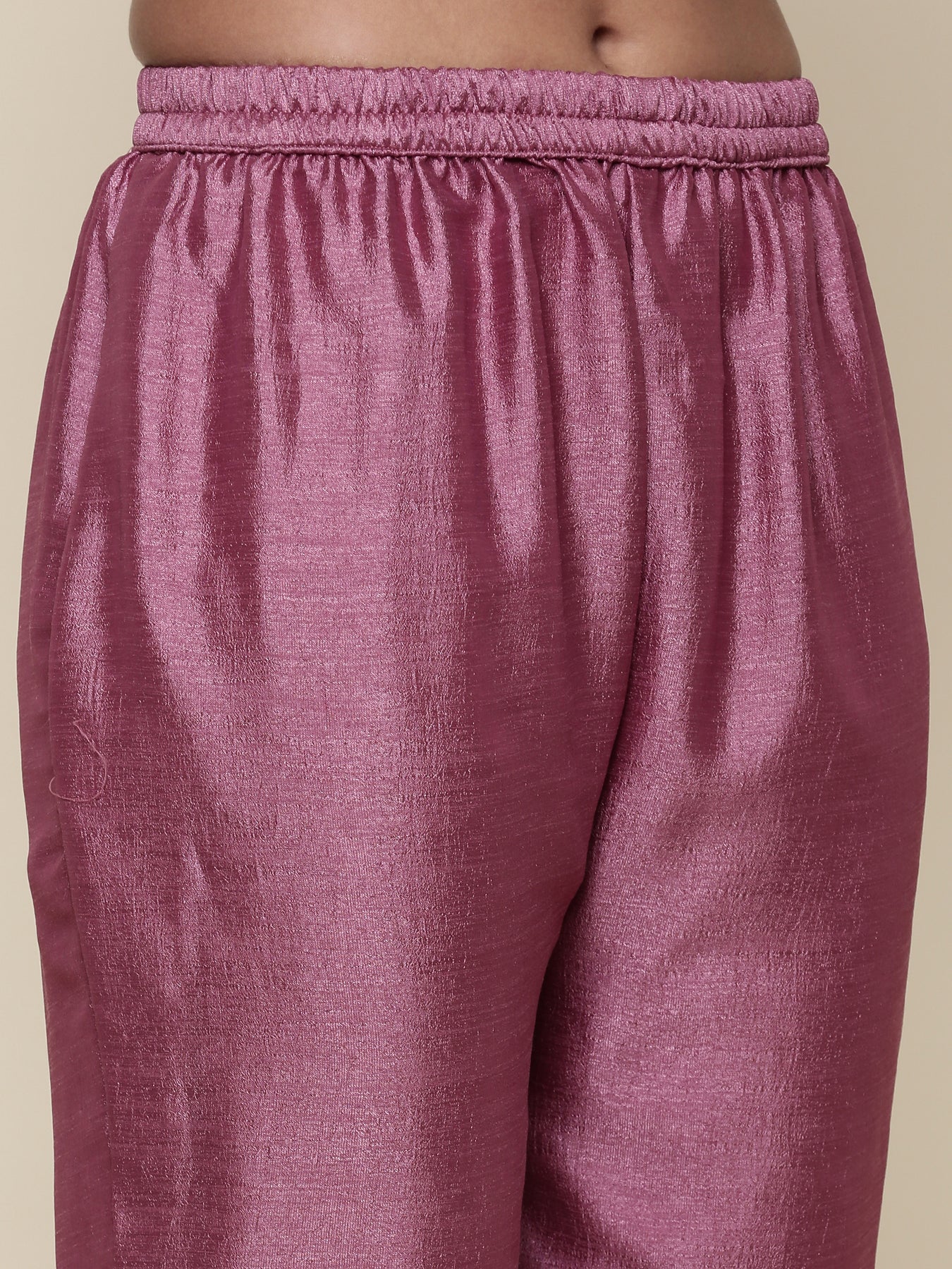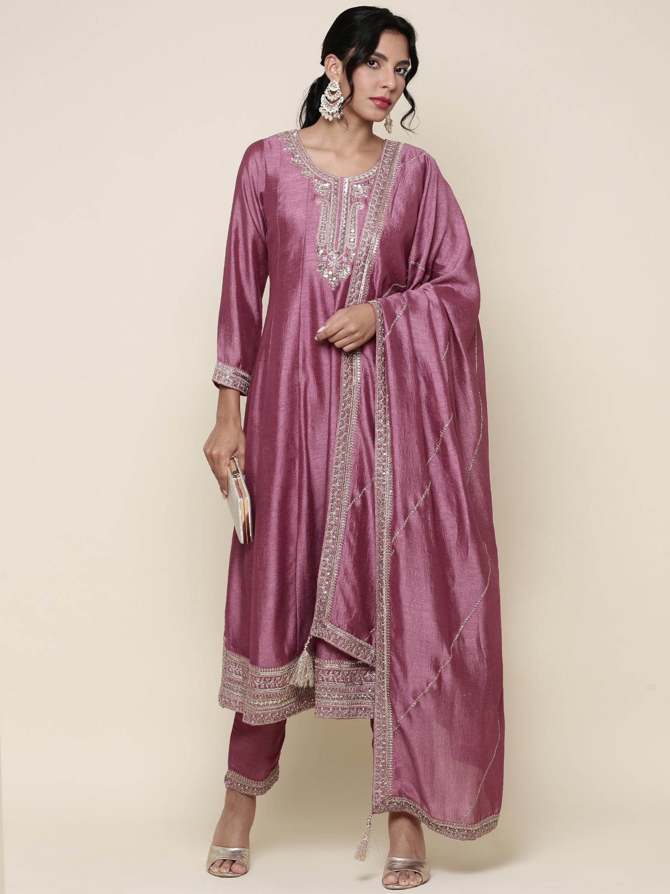 This onion pink silk three-piece anarkali set features intricate embroidery that highlights traditional craftsmanship. The luxurious silk fabric ensures a smooth, elegant fall, while the detailed embroidery enhances its graceful appeal. Ideal for weddings and special occasions, this expertly crafted ensemble offers a refined and sophisticated look that blends classic style with contemporary elegance.