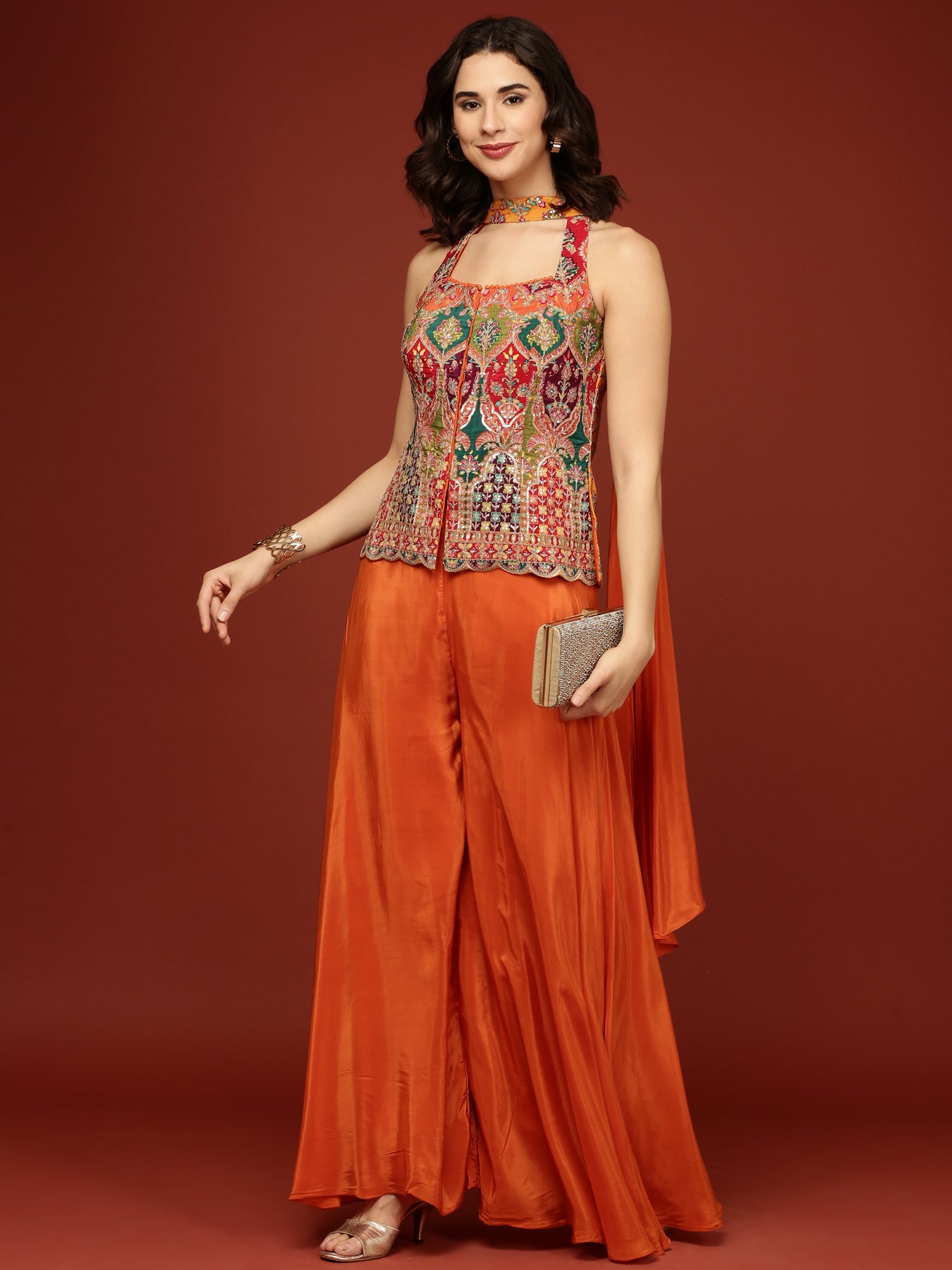 This Orange Chinnon Crop Top Palazzo Set blends contemporary style with comfort, featuring a vibrant crop top crafted from breathable chinnon fabric. Paired with flowy palazzo pants, this ensemble offers a chic silhouette ideal for casual outings or festive occasions. Its lightweight texture ensures ease of movement while maintaining a polished look, making it a versatile addition to your wardrobe.