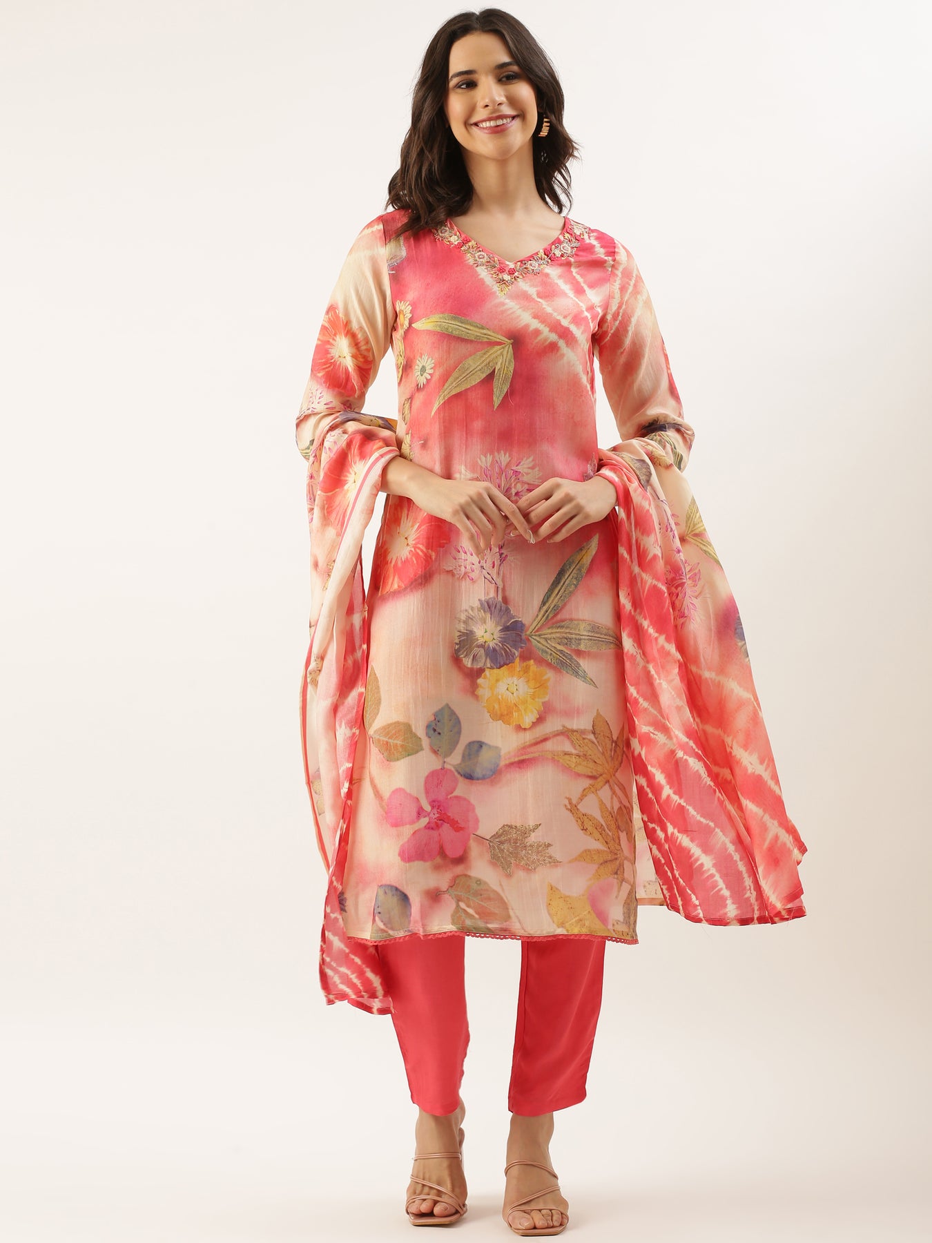 Elevate your wardrobe with this Peach Muslin Three Piece Set, featuring delicate printed patterns and intricate embroidery. Crafted from breathable muslin fabric, it offers both comfort and elegance. The coordinated pieces blend seamlessly for a refined look suitable for any occasion, combining traditional artistry with modern sophistication.
