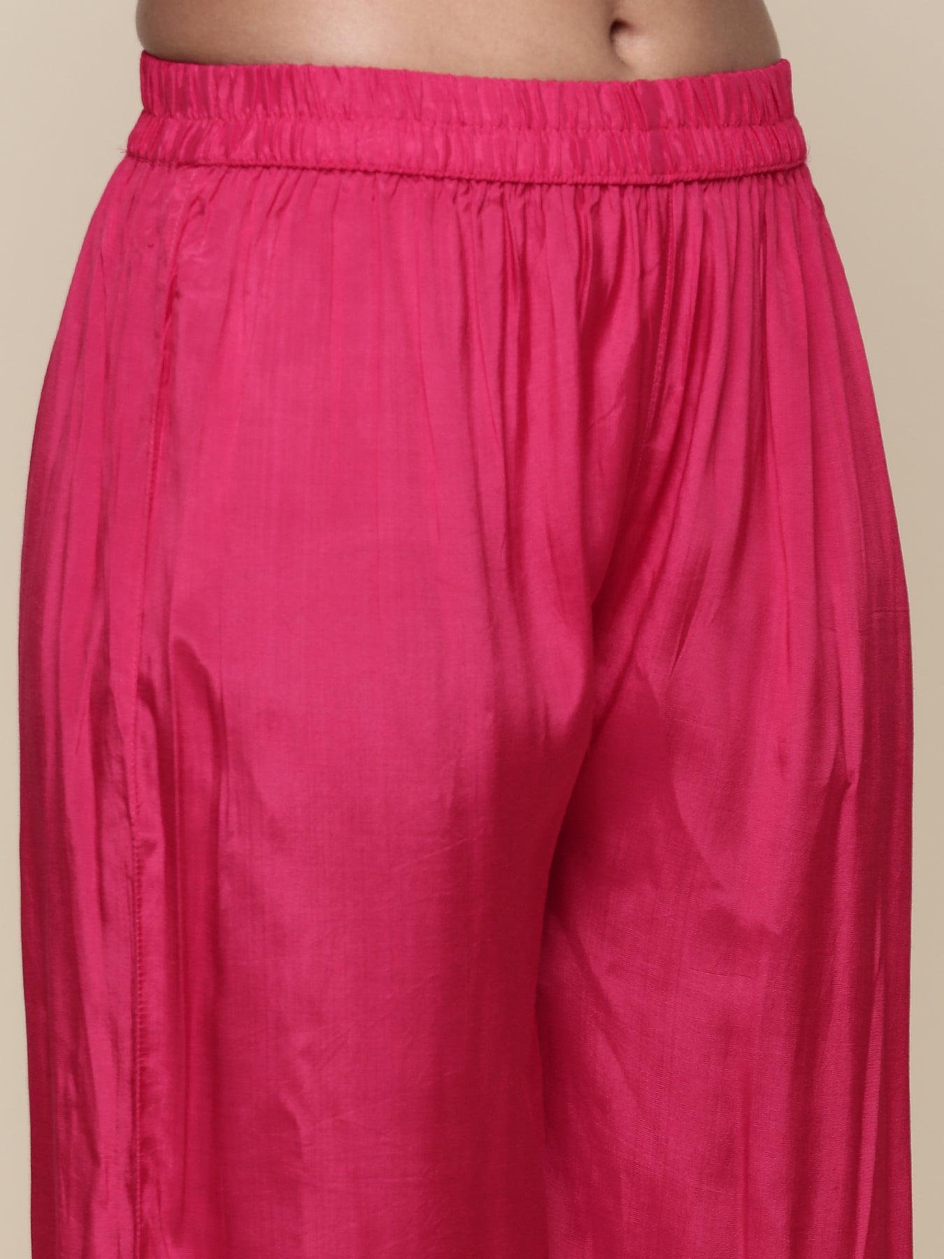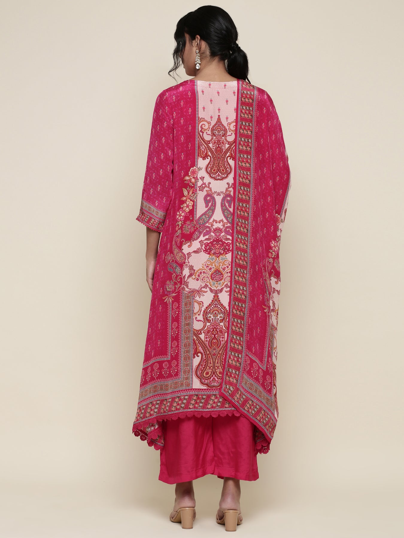 This Pink Digital Printed Crepe Three-Piece Suit Set combines sophisticated design with superior comfort. Crafted from high-quality crepe fabric, the suit features vibrant digital prints that enhance its refined texture. The set includes a tailored kurta, coordinating bottoms, and a matching dupatta, creating a harmonious and elegant ensemble. Perfect for formal events and festive occasions.
