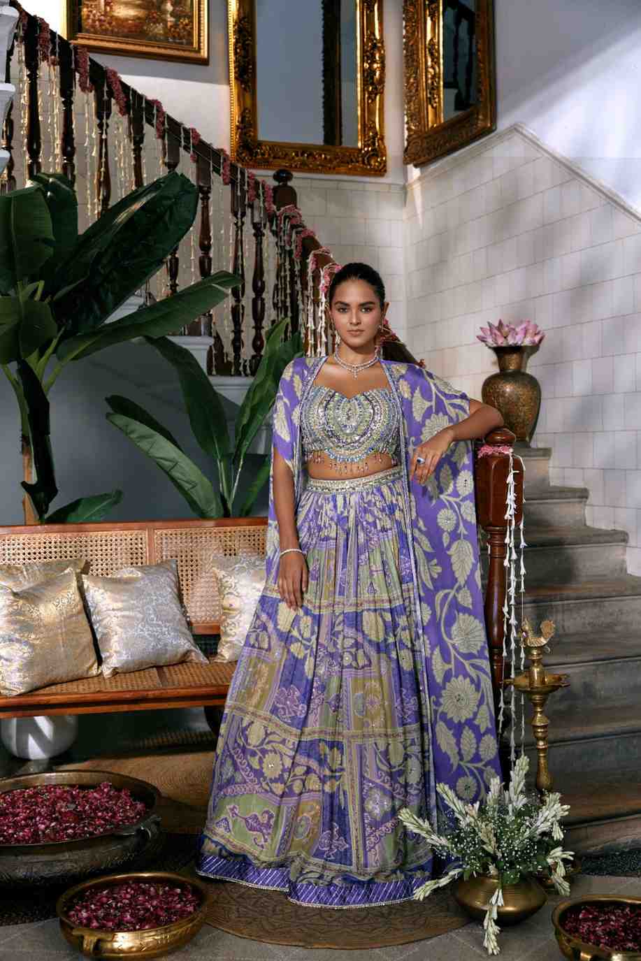 Elevate your traditional wardrobe with this Purple Chinon jacket ghagra set, adorned with intricate hand embroidery. Crafted from soft Chinon fabric, it offers a graceful drape and comfortable fit. The detailed embroidery adds a refined touch, making it perfect for special occasions where elegance and craftsmanship are essential. This set seamlessly blends classic charm with contemporary style for a sophisticated look.