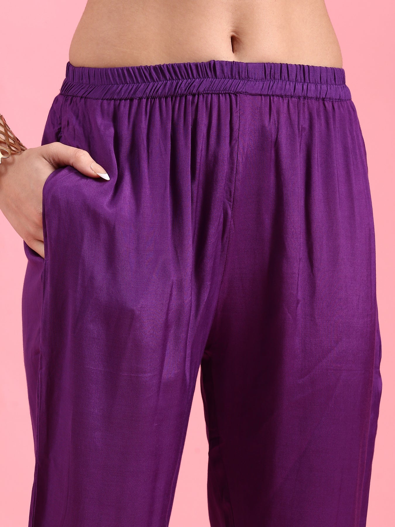 Elevate your wardrobe with this Purple Crepe Printed Three Piece Suit Set, crafted from soft crepe fabric for a comfortable yet refined fit. The vibrant print adds a touch of elegance, perfect for both casual and formal occasions. This set includes a matching top, bottom, and dupatta, offering a coordinated look that blends style with versatility. Ideal for those who appreciate effortless sophistication with lasting quality.