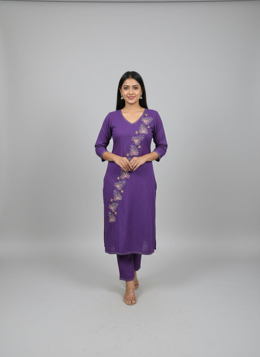 Purple Linen Floral Hand Embroidered Two Piece Set