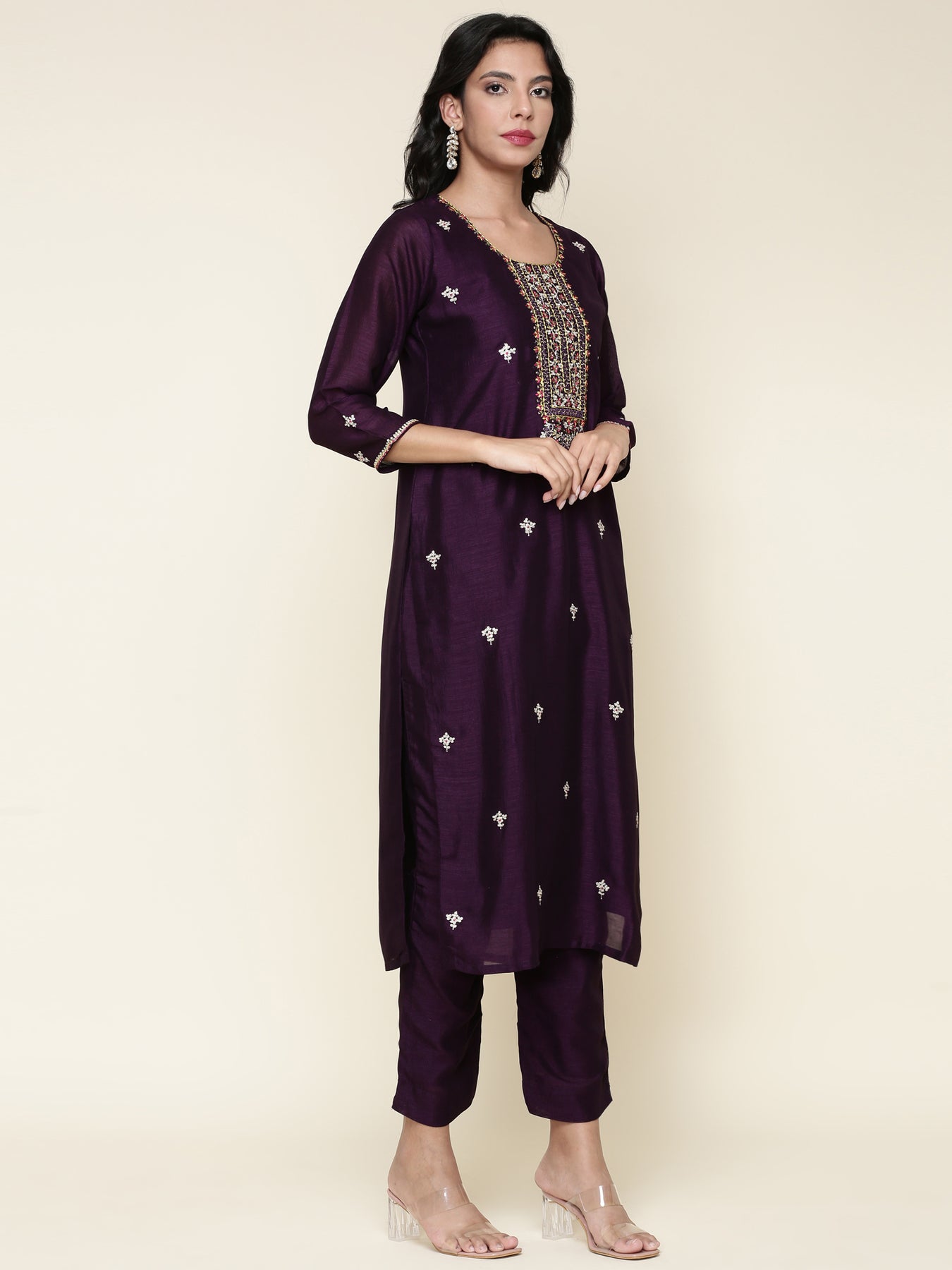 Elevate your wardrobe with this Purple Silk Embroidered three-piece suit set, paired with a contrasting dupatta for a striking finish. Crafted from luxurious silk, the suit features intricate embroidery that enhances its elegance and sophistication. The complementary dupatta adds a dynamic contrast, perfect for special occasions or festive events. This ensemble combines traditional craftsmanship with contemporary style, offering both comfort and a distinguished look.