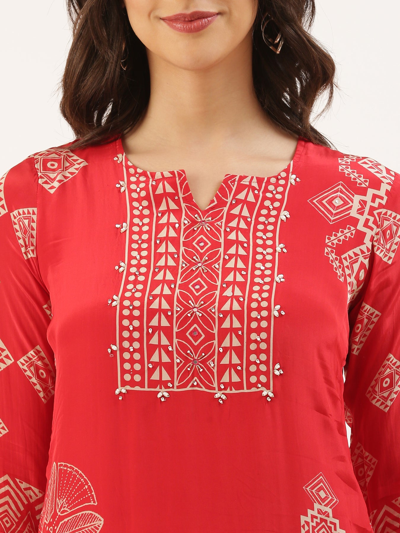 Elevate your wardrobe with this Red Crepe Printed Three Piece Suit Set, crafted to combine comfort and style effortlessly. The lightweight crepe fabric ensures breathability, while the intricate print adds a refined, contemporary touch. Designed as a coordinated three-piece ensemble, it offers versatility for both formal occasions and festive events, making it a sophisticated choice for the modern wearer.