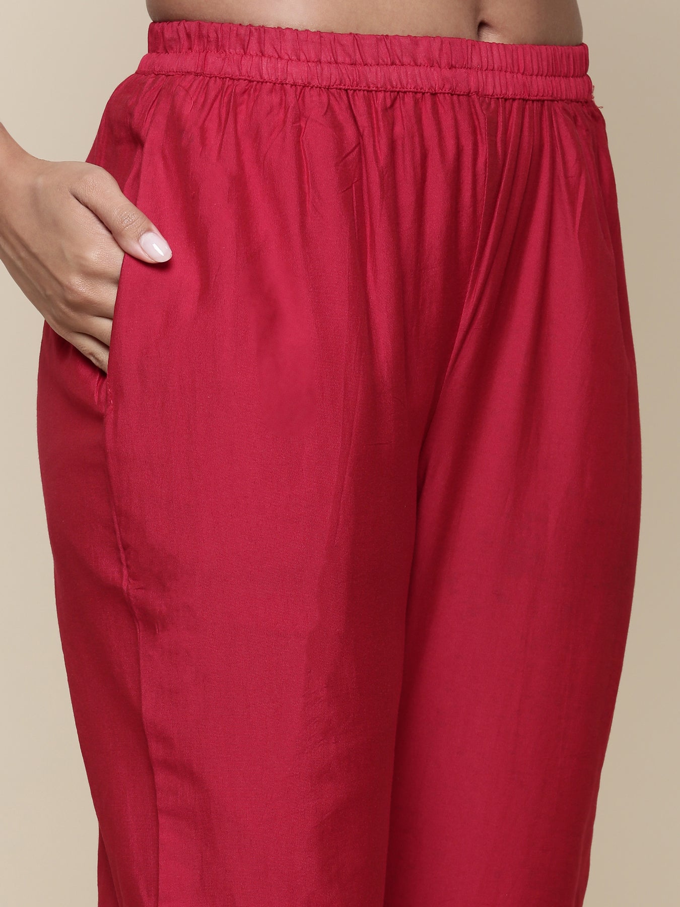 Experience elegance with this Silk red embroidered three-piece suit set. Crafted from smooth silk, the rich red fabric is adorned with intricate embroidery, enhancing its refined appeal. Perfectly tailored, this set offers a sophisticated silhouette suitable for formal occasions, combining traditional charm with modern style for a timeless look.