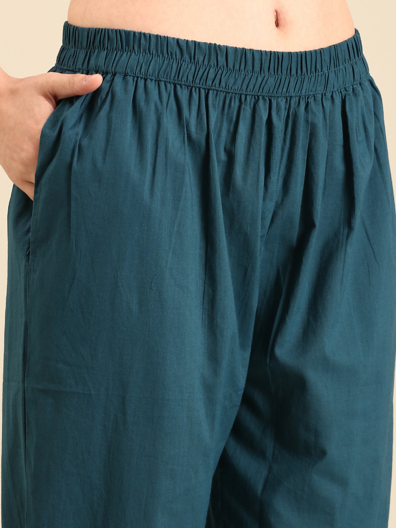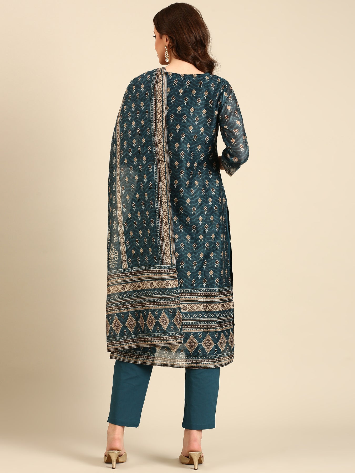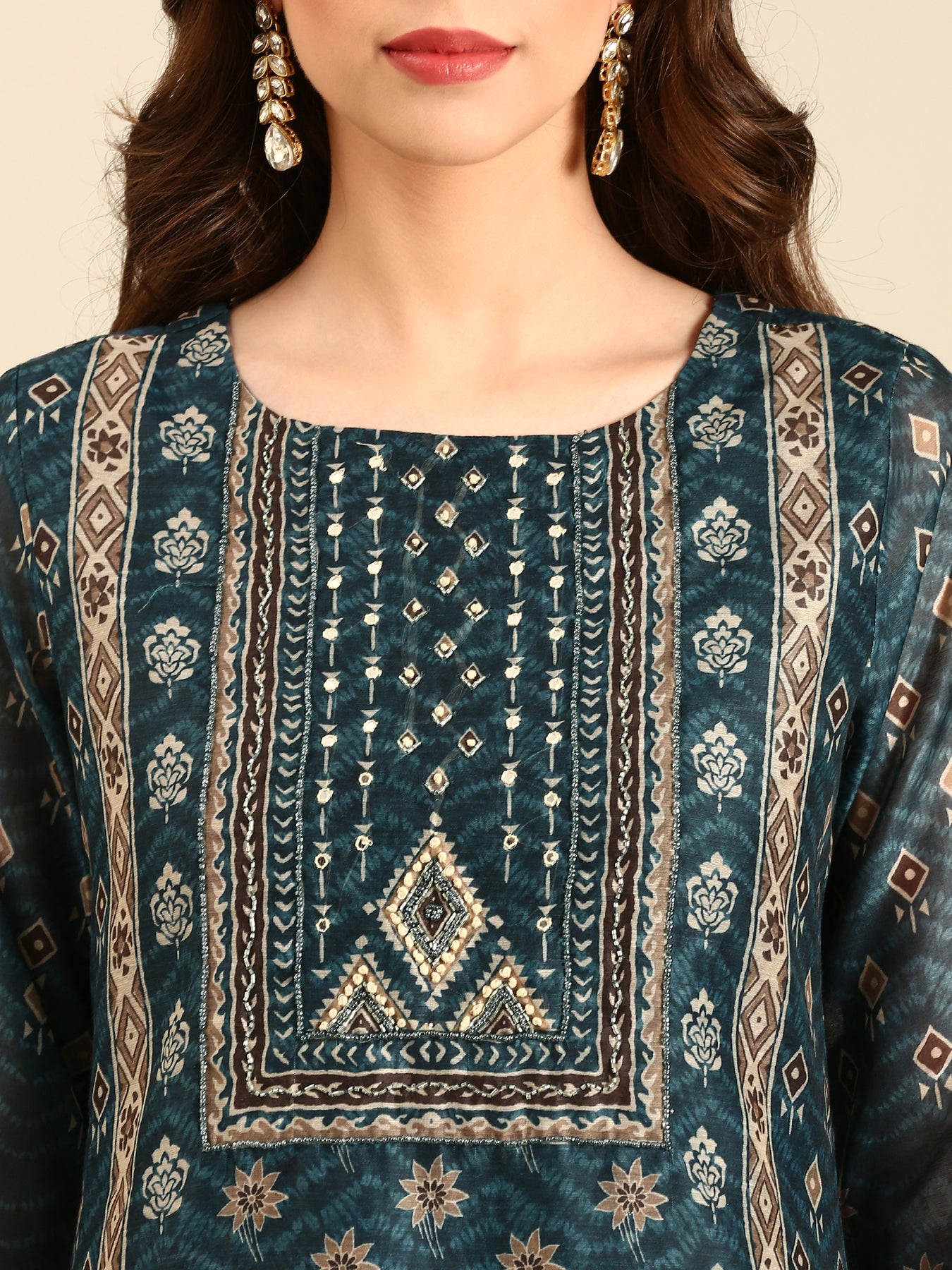 Elevate your wardrobe with this teal three-piece suit set featuring exquisite blue organza fabric adorned with an all-over print. The elegant neck boasts intricate kardhana and delicate moti work, adding a touch of refined charm. Perfect for making a graceful statement at any occasion, this set combines comfort and style effortlessly.
