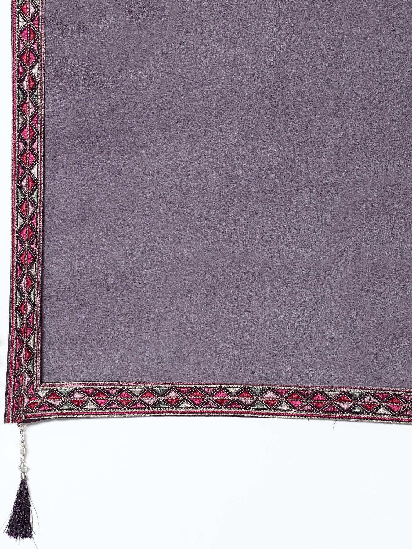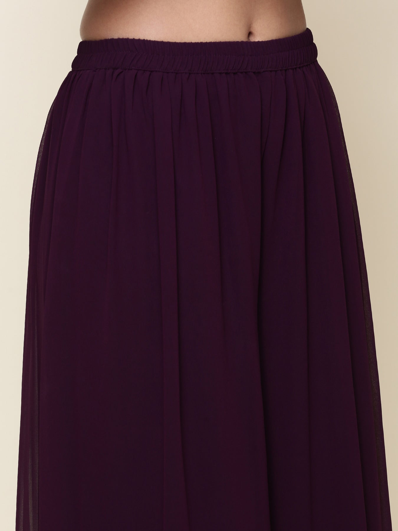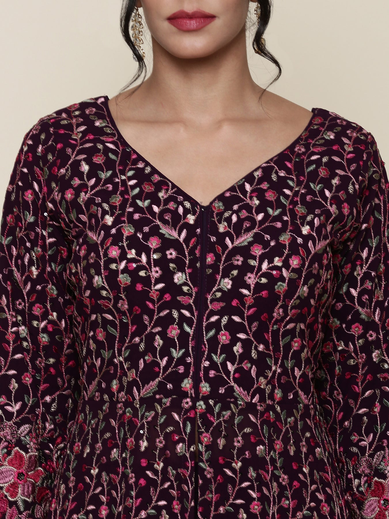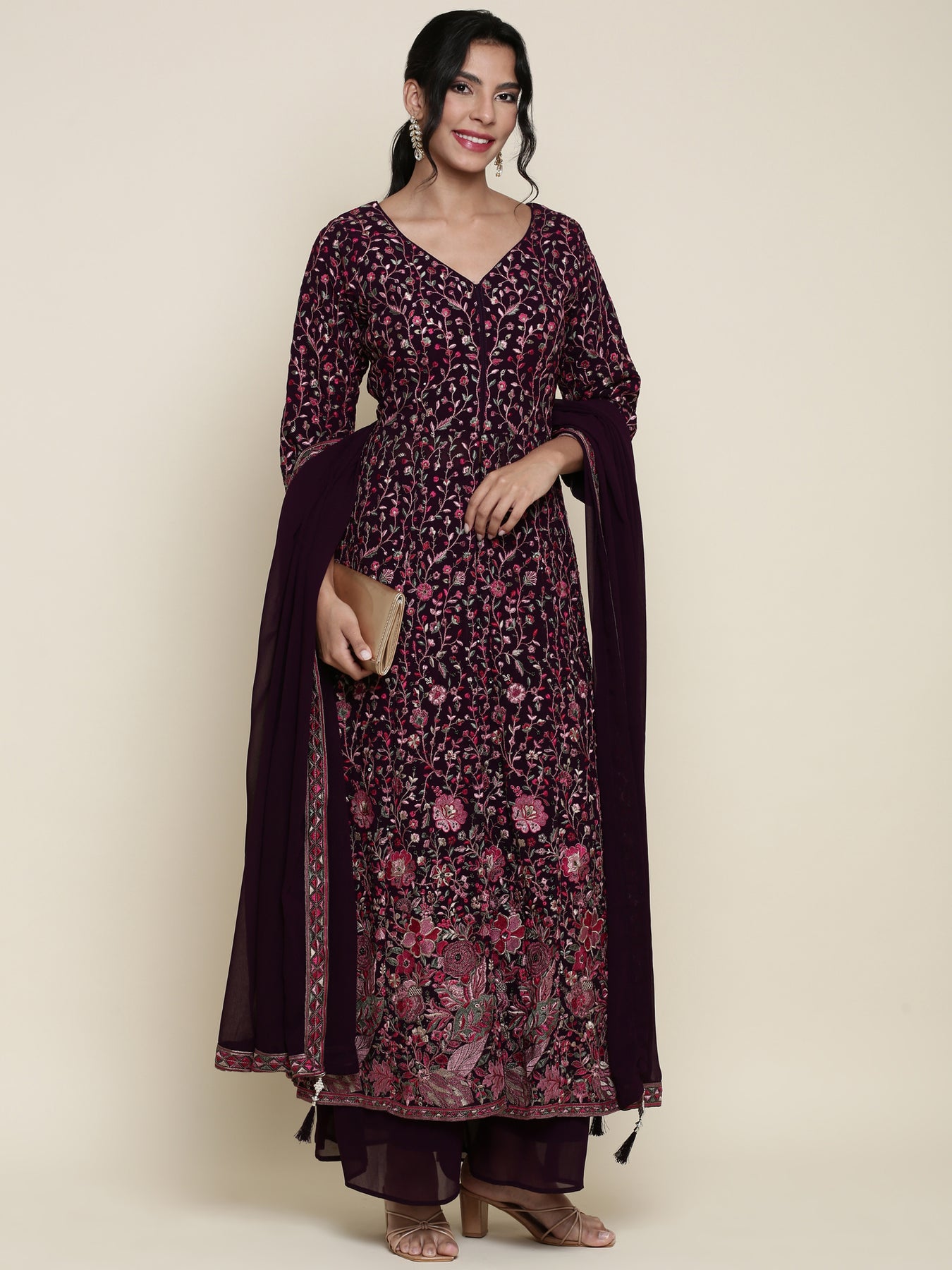 This wine georgette anarkali three-piece set features an exquisitely embroidered front panel, adding a touch of timeless elegance. Crafted from lightweight georgette fabric, it offers graceful drape and comfort. The ensemble includes a matching silt bottom and dupatta, creating a cohesive and sophisticated look for special occasions.
