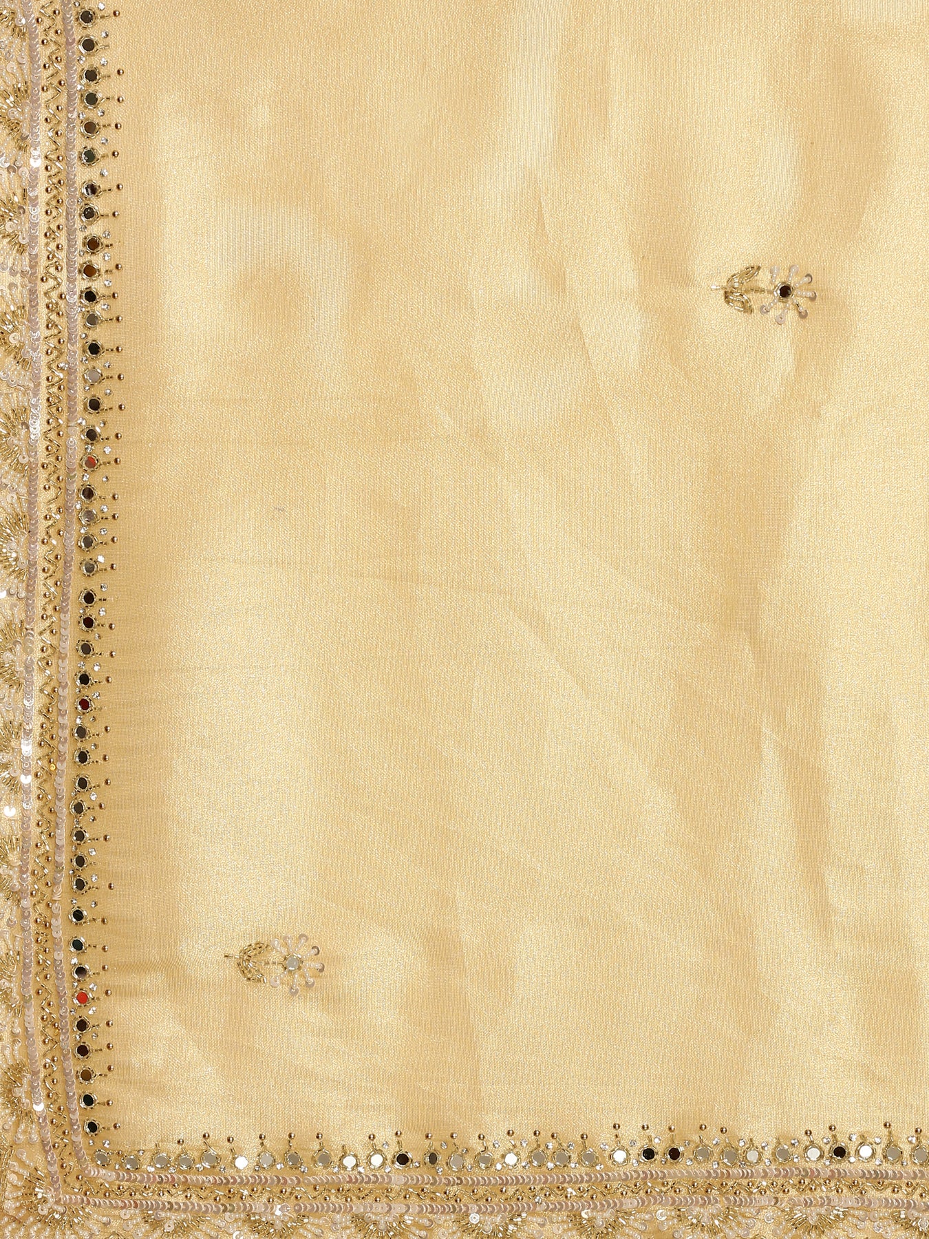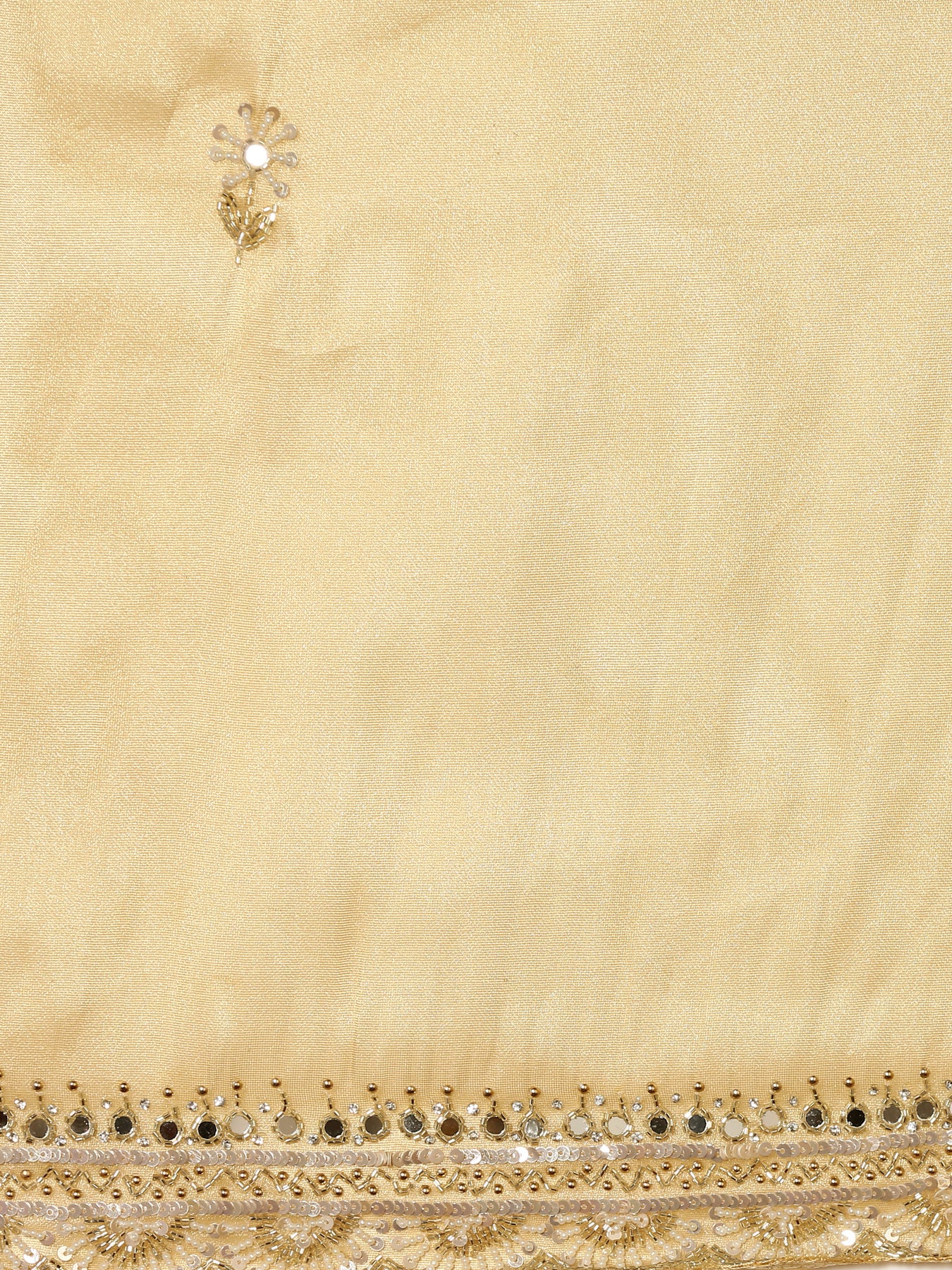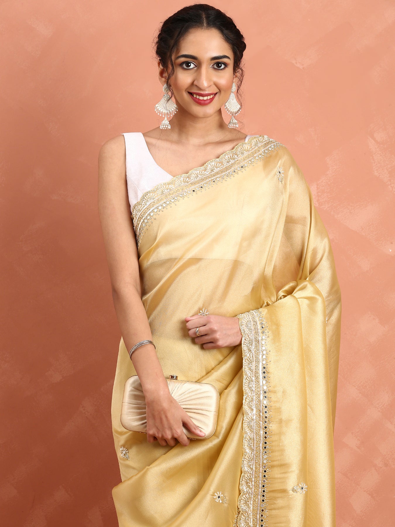 Elevate your traditional wardrobe with this exquisite yellow tissue saree, featuring intricate cut dana embroidery enhanced by delicate mirror work. The lightweight tissue fabric offers a graceful drape, while the detailed embellishments catch the light beautifully, adding a subtle shimmer. Perfect for festive occasions and elegant gatherings, this saree blends classic craftsmanship with a refined, contemporary appeal.